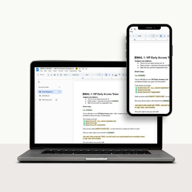 Yes. Whether you’re using Jackrabbit, DanceStudio-Pro, or a CRM like Mailchimp or ConvertKit, this sequence is copy/paste ready.