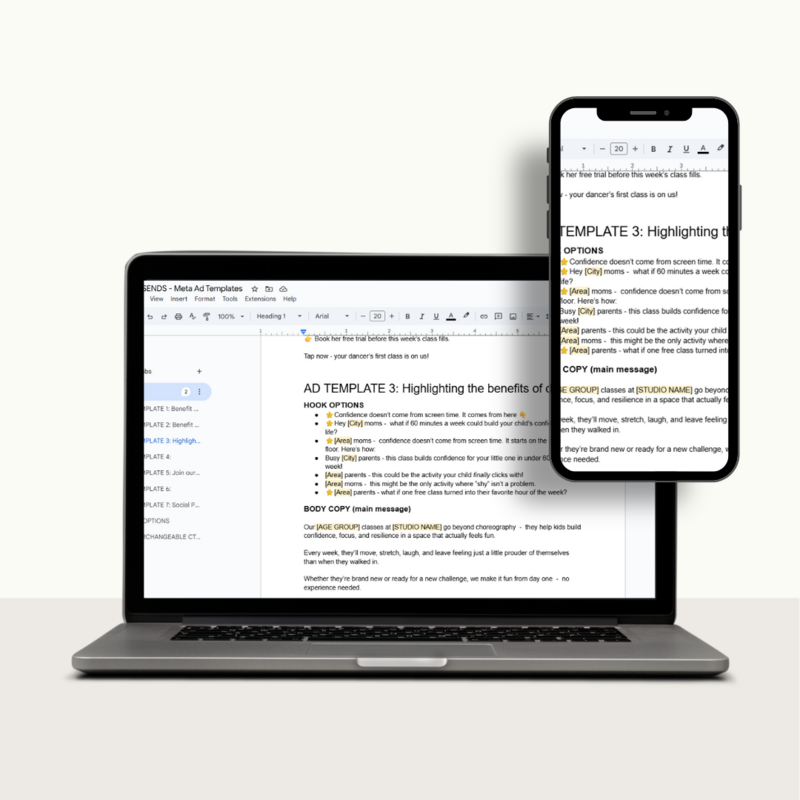 You’ll get a PDF and editable Google Doc version. Simply choose your favorite version of each ad, personalize it with a few quick details, and copy/paste it into your ad manager (whether it’s Meta Business Suite or your studio software).